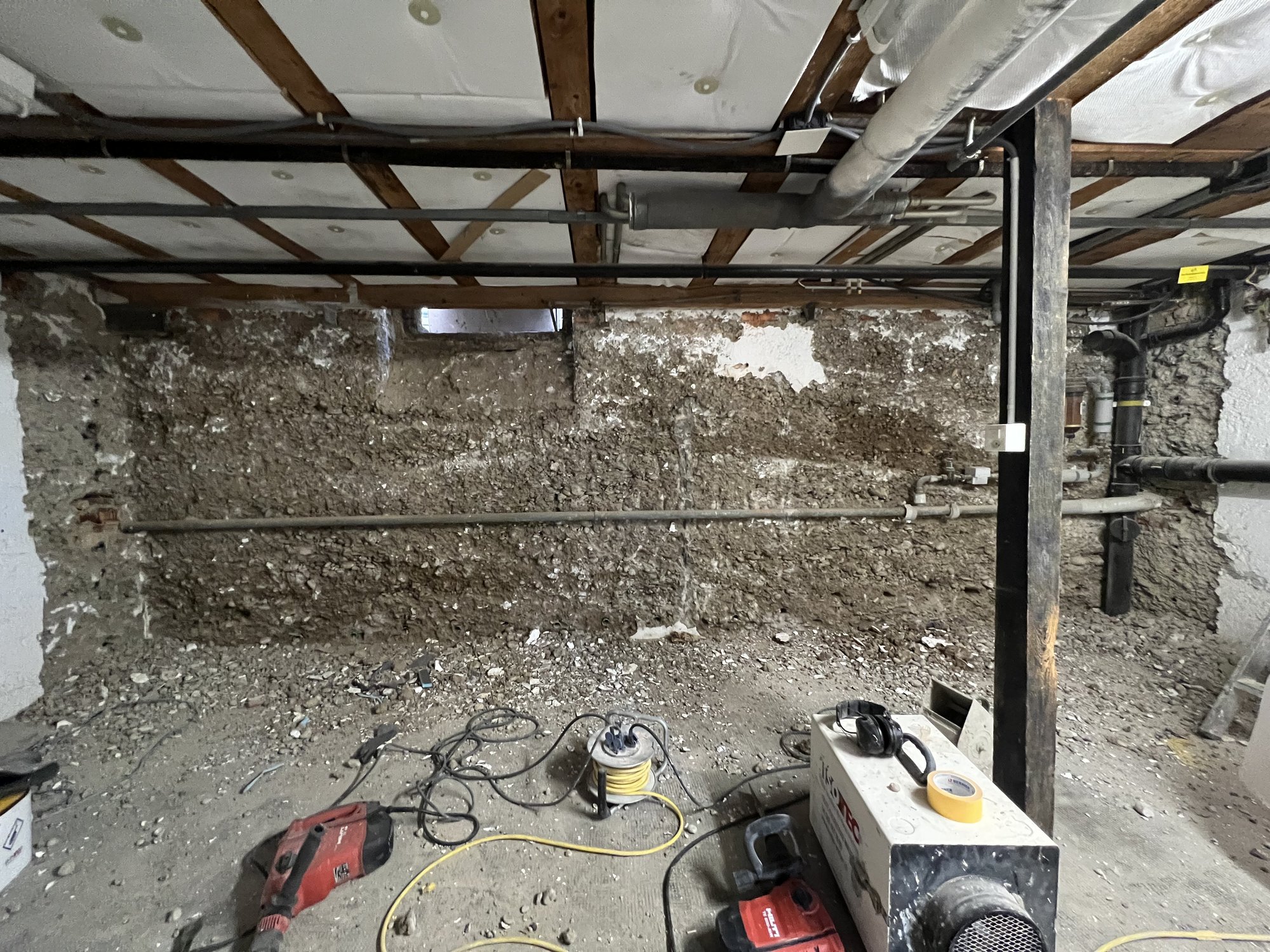 Ziel war es, den Keller nachhaltig vor weiteren Feuchteschäden zu schützen. Die Horizontalsperre wurde an den Aussenwänden errichtet. Hierfür wurden im Abstand von jeweils ca. 10 cm Löcher in die Wände gebohrt und die Injektionszone anschliessend mit Hilfe von Heizstäben getrocknet. Flüssiges Paraffin wurde in die Injektionszone eingespritzt, um vorhandene Kapillarporen vollständig und dauerhaft zu versiegeln, sodass Feuchtigkeit nicht mehr ins Erdgeschoss aufsteigen kann.