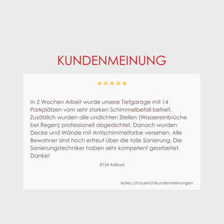 Nach unseren Vorstellungen abgelaufen. Man hat zuvor klar kommuniziert, wie die Abdichtung abläuft. Nicht nur mit dem Resultat, den Kosten sondern auch mit dem sehr guten Umgang sind wir sehr zufrieden. Isotec kann ich sehr empfehlen.