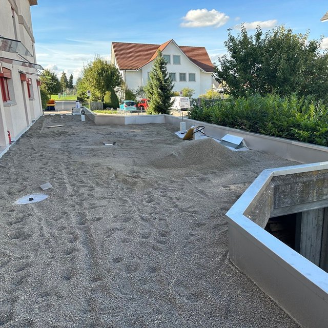 Der Splitt (60 mm) wird auf die Fläche gepumpt und gleichmässig verteilt. Inkl. Splitt Stärke 4/8 mm.