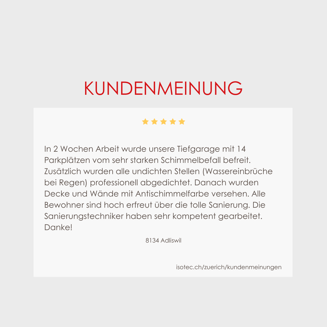 Trockenlegung 1 A funktioniert. Die Präsentation (Beratung), die Professionalität, die Offerte und die annehme Art und Weise haben mich überzeugt. Herr Leisi war für mich da. Die Leistung war grosse klasse. Isotec würde ich wieder beauftragen.