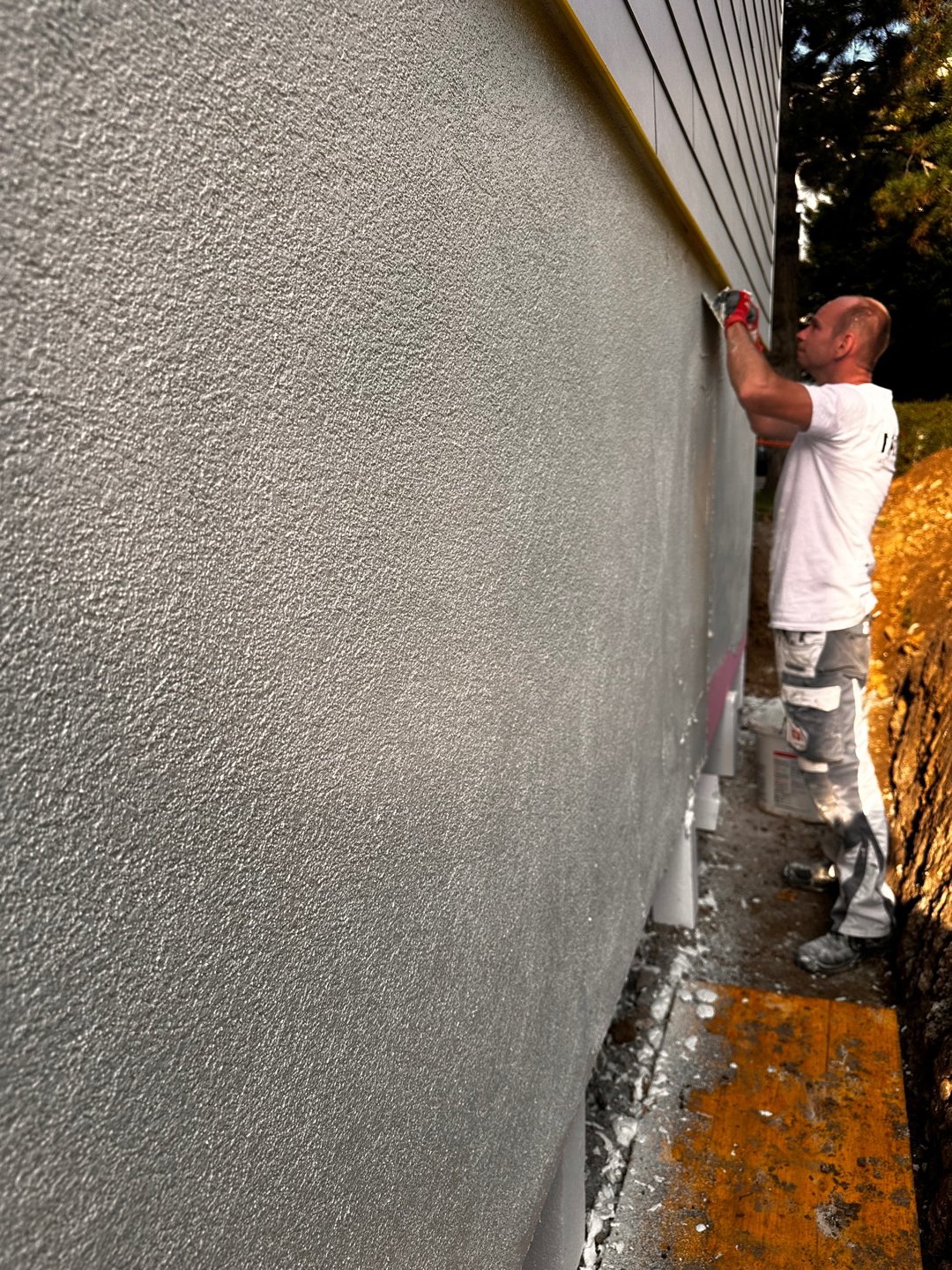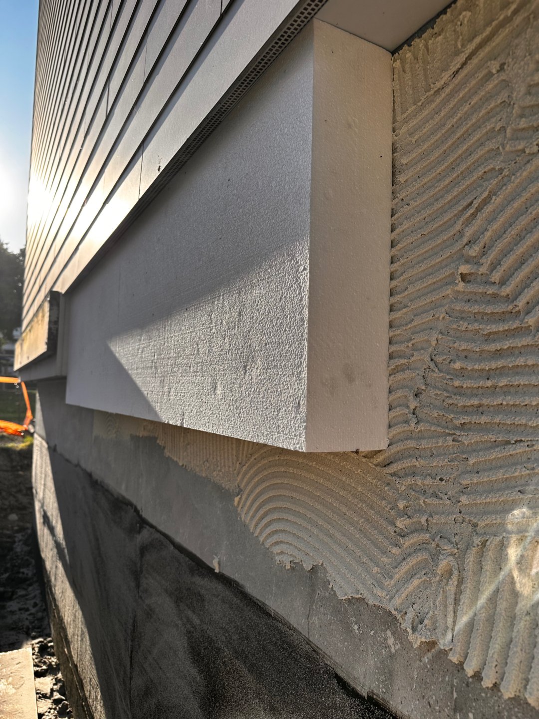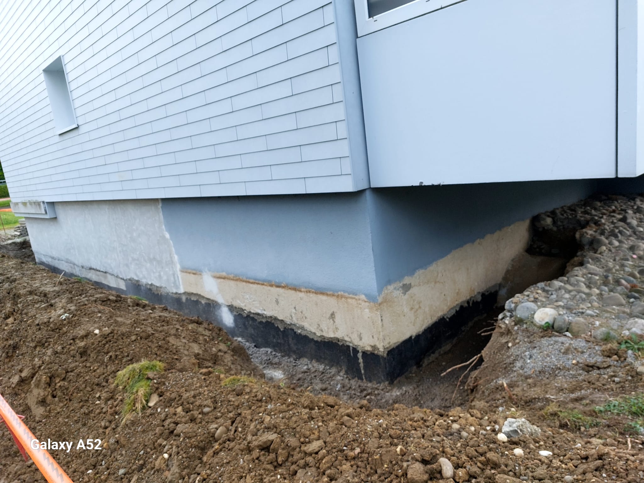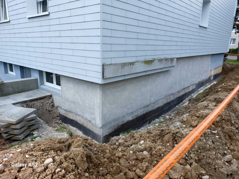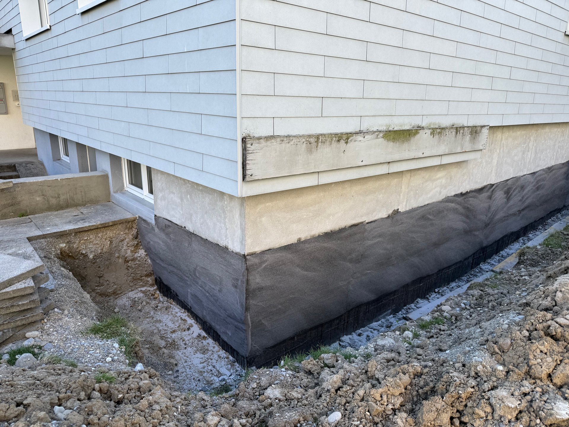Die Sanierung umfasste einen umfassenden Aushub und die Installation einer Aussenabdichtung. Zunächst wurden die erdberührten Außenwände freigelegt, um die Standsicherheit zu gewährleisten. Dies erfolgte gemäß den Vorgaben der DIN 4124. Danach wurde das freigelegte Mauerwerk gründlich gereinigt, um eine tragfähige Basis zu schaffen. Die ISOTEC-Fachleute verwendeten eine zweilagige Abdichtung aus ISOTEC-VAS, einer kunststoffmodifizierten Bitumendickbeschichtung. Diese bietet höchste Sicherheit gegen Feuchtigkeit und ist speziell für durchfeuchtete erdberührte Bauteile entwickelt. Die Abdichtung wurde in zwei Schichten aufgetragen, um eine vollständige Versiegelung zu gewährleisten. Eine Verstärkungseinlage aus Gewebe sicherte die Flexibilität und Rissüberbrückung der Abdichtung. Nach der Trocknung wurde die Baugrube wieder verfüllt und eine Schutzschicht aus Polystyrolplatten aufgebracht, um die Abdichtung zu schützen und die Wärmedämmung zu verbessern. Diese Maßnahmen stellten sicher, dass der Keller dauerhaft trocken bleibt und vor Feuchtigkeit geschützt ist.
