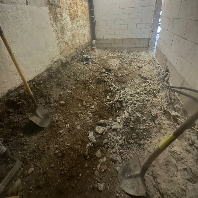 Mittels Handschachtung wird der Kellerboden so vorbereitet, dass die Höhen des Untergrund für die Bodenplatte ausnievelliert sind. Entsprechend muss die Bodenplatte durchgehend im ganzen Kellergeschoss mit einer Stärke von 25 cm erreichen.