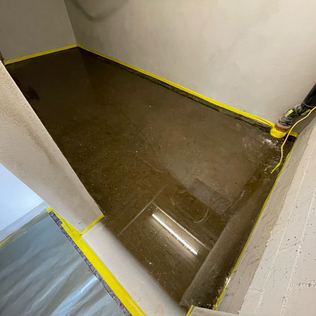 Die Grundierung Mapefoor 914 als Feuchtigkeitssperre wird in 2 Arbeitsgängen aufgetragen. im zweiten Arbeitsgang wird dies mit Quarzsand vermischt. (Verbrauch 1.2 kg/m2)