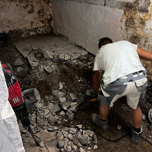 Entfernen der Keramikplatten, Wandputze und/oder Altanstriche werden mechanisch entfernt. Loses Fugenmaterial wird ca. 2 cm tief ausgekratzt. Anschliessend werden die freigelegten Mauerwerksflächen von Wandputzresten und bindestörenden Stoffen gesäubert. Dies erfolgt je nach Untergrundbeschaffenheit z.B. mit Stemmhammer, Diamantschleifer oder sonstigen geeigneten Massnahmen.