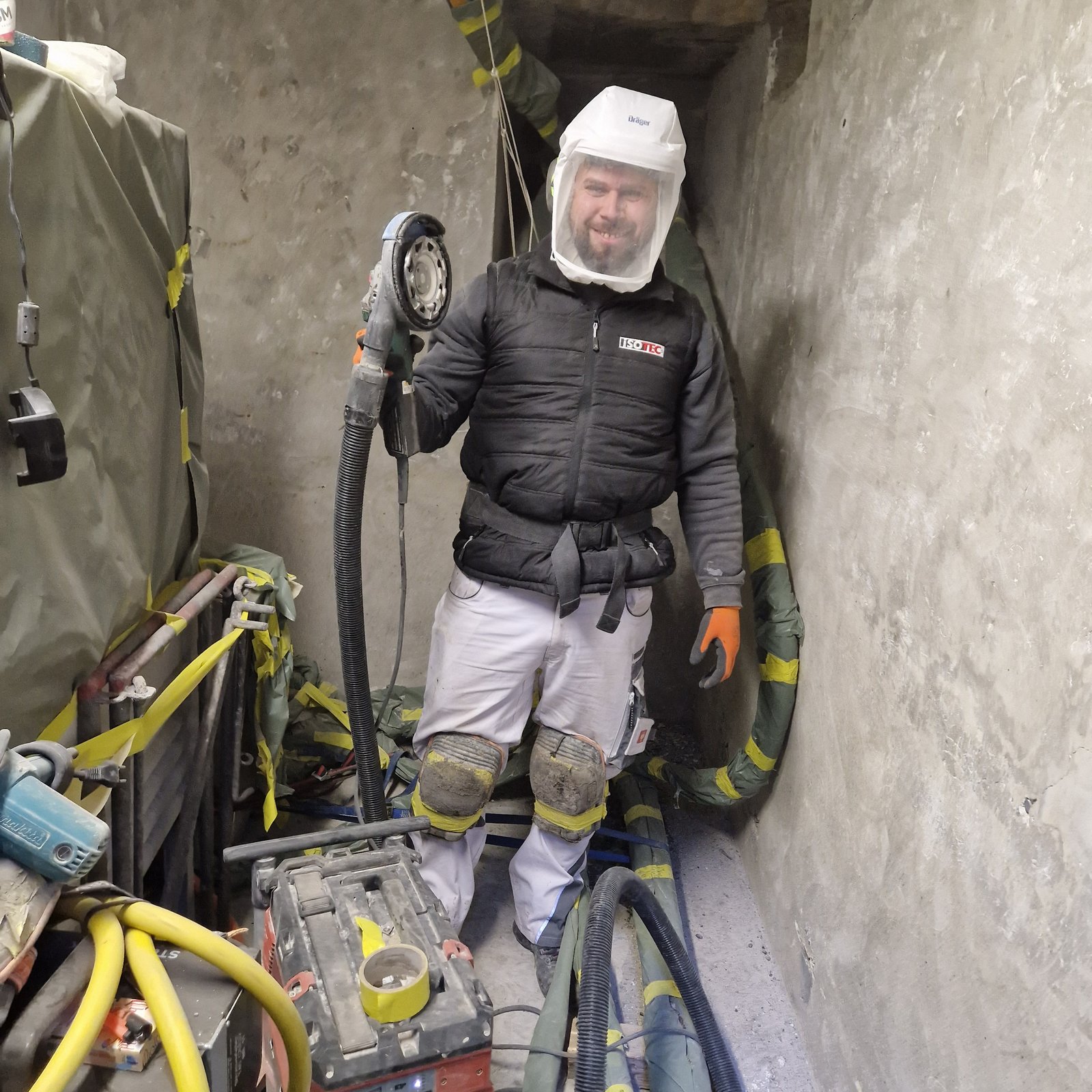 Der Bodenbelag wird mit einem Betonschleifer bearbeitet. Grössere Vertiefungen, Fehlstellen oder Ausbrüche werden mit ISOTEC-Dichtspachtel bearbeitet. Böden mit Rissen und Fugenwerden mit einem Gemisch aus ISOTEC-Versiegelung und Quarzsand vorbereitet.Anschliessend wird der bearbeitete Untergrund gesäubert.