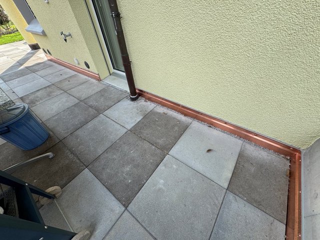 Die Sanierung der Terrasse in Wiesendangen erforderte präzise und effektive Massnahmen. Der ISOTEC-Fachbetrieb Abdichtungssysteme Scheibli AG setzte auf eine mehrschichtige Abdichtungslösung. Zunächst wurde die Terrasse Rückgebaut, die Platten und die defekte Abdichtung wurde entfernen. Die Dampfsperre wurde kontrolliert und wo nötig entfernt. Die gesamte Fläche wurde gereinigt und ein Voranstrich wurde aufgebracht. Eine Dampfbremse wurde vollflächig aufgeschweisst inkl. Blechanschlüsse, Kanten und Kehlen. Eine Ausgleichschüttung um das Gefälle anzupassen wurde aufgebracht. Mit dem Flüssigkunststoff wurden der Gebäudeanschluss und Fensteranschlüsse angeschlossen. Die Deckstreifen aus Kupfer bilden einen schönen Abschluss zum Gebäude. Durch diese umfassende Sanierung ist die Terrasse nun gegen zukünftige Witterungseinflüsse geschützt, und die Kundin kann ihre Terrasse wieder uneingeschränkt nutzen.
