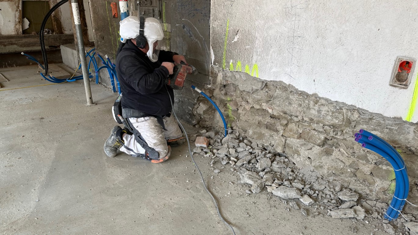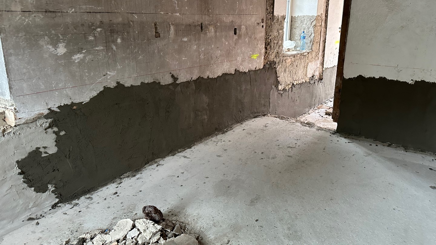 Wir haben zunächst das abzudichtende Mauerwerk freigelegt und es sorgfältig gereinigt. Im Bereich des Wand-Sohlen-Anschlusses wurde eine Nut gestemmt und eine Hohlkehle erstellt. Dann haben wir unseren ISOTEC-Dichtputz aufgetragen. Er sorgt für eine optimale Haftung und eine gleichmässige Dicke der nachfolgenden Abdichtungsschichten.